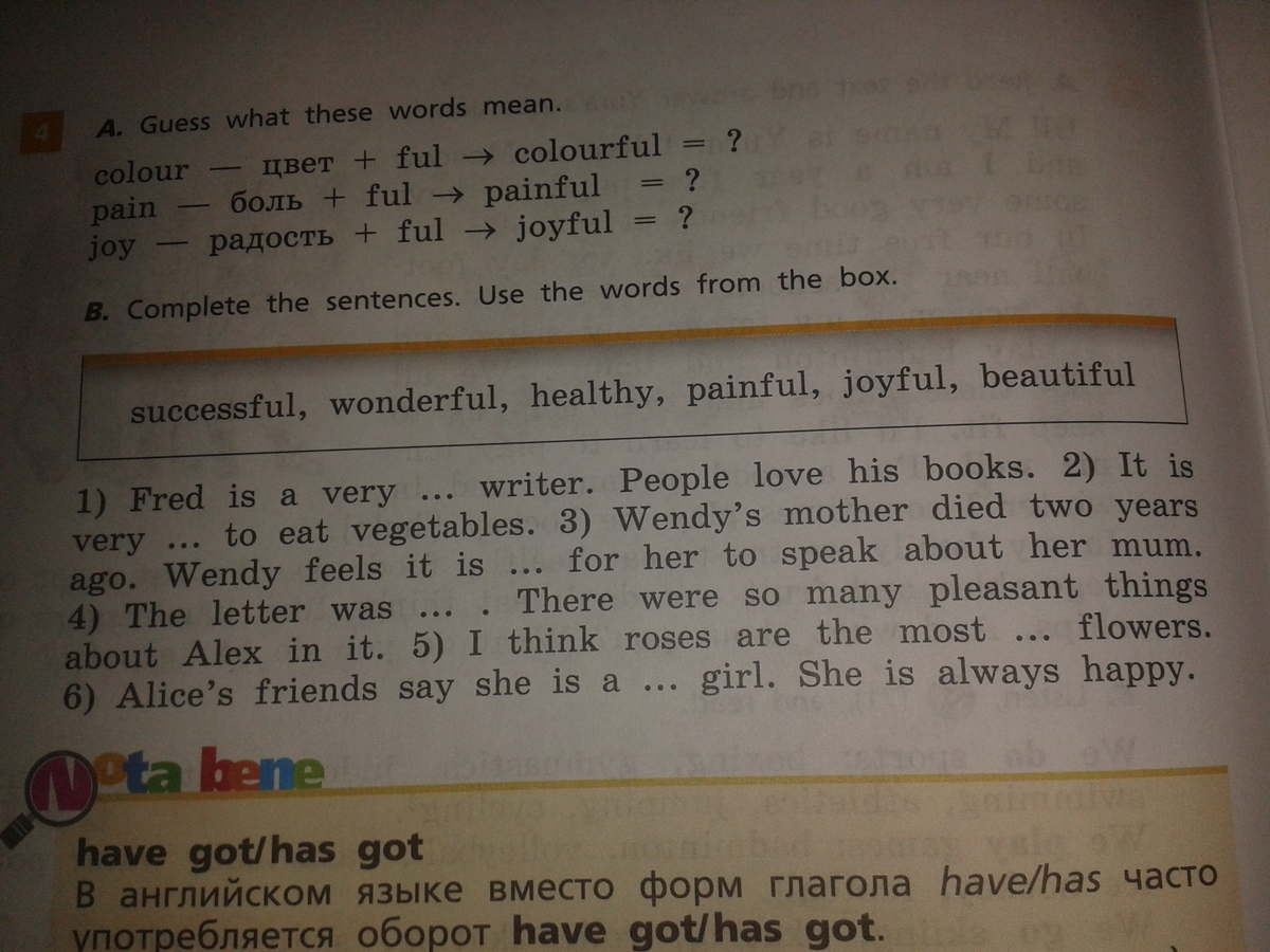 Colourful-красочный, painful-болезненный , joyful-радостный.