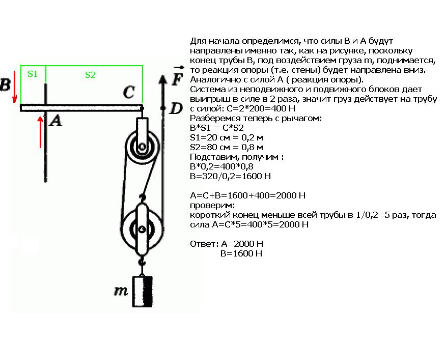 Стальная труба длиной 1 м заделана в стену на глубину 20 см. К свободному концу трубы в точке С подвешены неподвижный и подвижный блоки (рис. ). Чему равны силы, действующие на стену в точках А и В, если для удержания груза массой m необходимо в точке D приложить силу 200 Н? (Трением в блоках пренебречь, блоки и трубу считать невесомыми.)