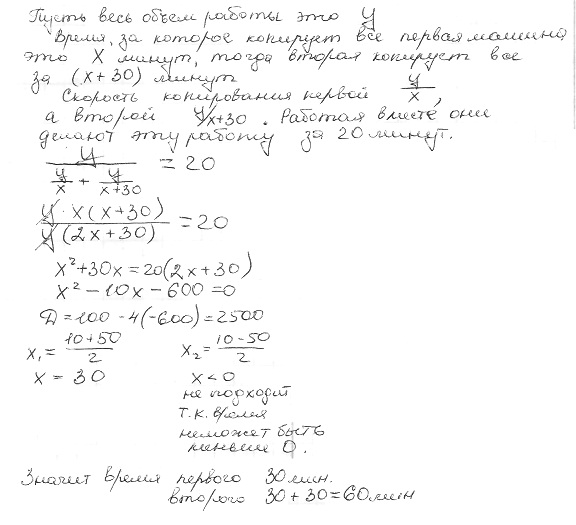 : На двух копировалтных машинах работающих одновременно, сделали копию пакета документов за 20 мин. За какое время можно было выполнить эту работу на каждый из них в отдельности, если известно, что при работе на первой машине для этого требуеться на 30 мин. меньше, чем при работе на второй