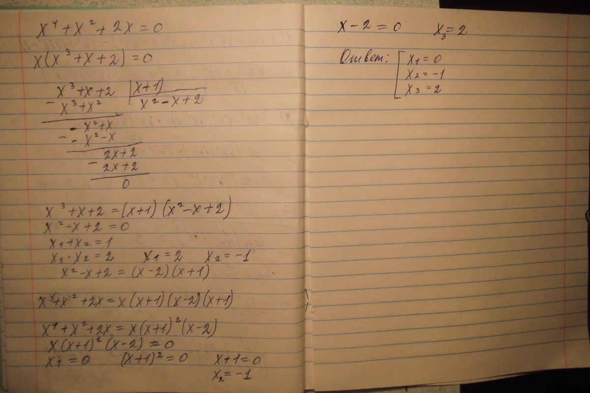 х³+х+2=0 ; х³+х+1+1=0 ; (х³+1)+(х+1)=0 ;(х+1)(х²-х+1)=0;х+1=0; х=-1 ну вот кароч ответ на x=-1