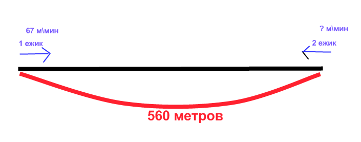 По лесной тропинке навстречу друг другу одновременно выбежали два ежика. Скорость одного 67 ммин, а скорость другого на 6 ммин больше. Через какое время ежики встретятся, если в начале между ними было 560 м?