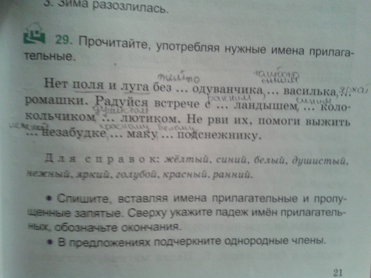 Нет поля и луга без желтОГО (Рп ) одуванчика, синЕГО (Рп) василька, белОЙ(Рп) ромашки. Радуйся встрече с душистЫМ (тп) ландышем, голубЫМ тв п ) колокольчиком, яркИМ( тп) лютиком. Не рви их, помоги выжить нежнОЙ (дп) незабудке, краснОМУ( дп ) маку, раннЕМУ( дп) подснежнику.