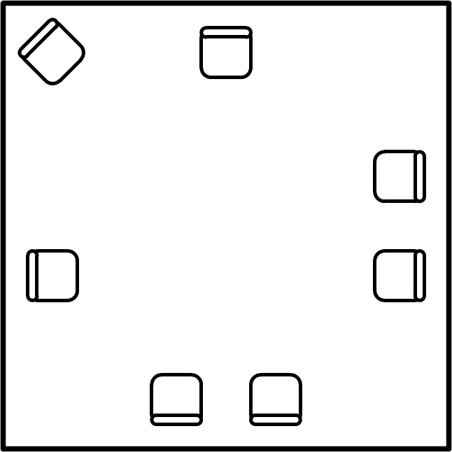 возле двух стен поставь по два стула, а возле других двух по одному и один в угол между ними. так как стул в углу относится к двум стенкам сразу, то получится, что возле каждой стены стоит два стула