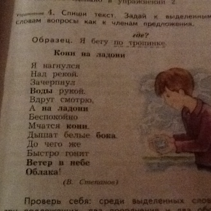 (что?) воды рукой,а на ладони (где?),мчатся кони(кто?), дышат белые бока( что?), ветер(что?) в небе(где?)облака(что?)