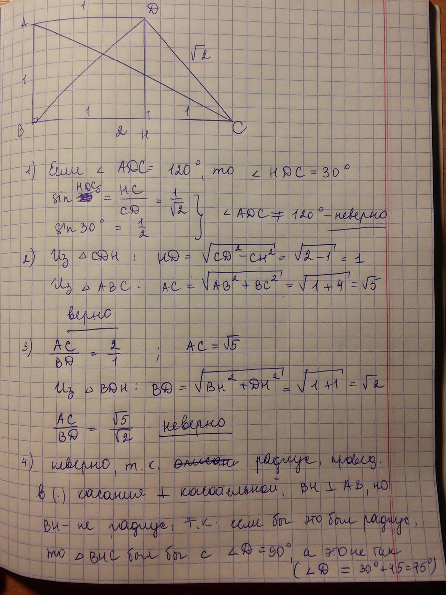 В прямоугольной трапеции ABCD угол ABC прямой, AD=1, DC= корень из 2, BC=2. Верно ли утверждение?