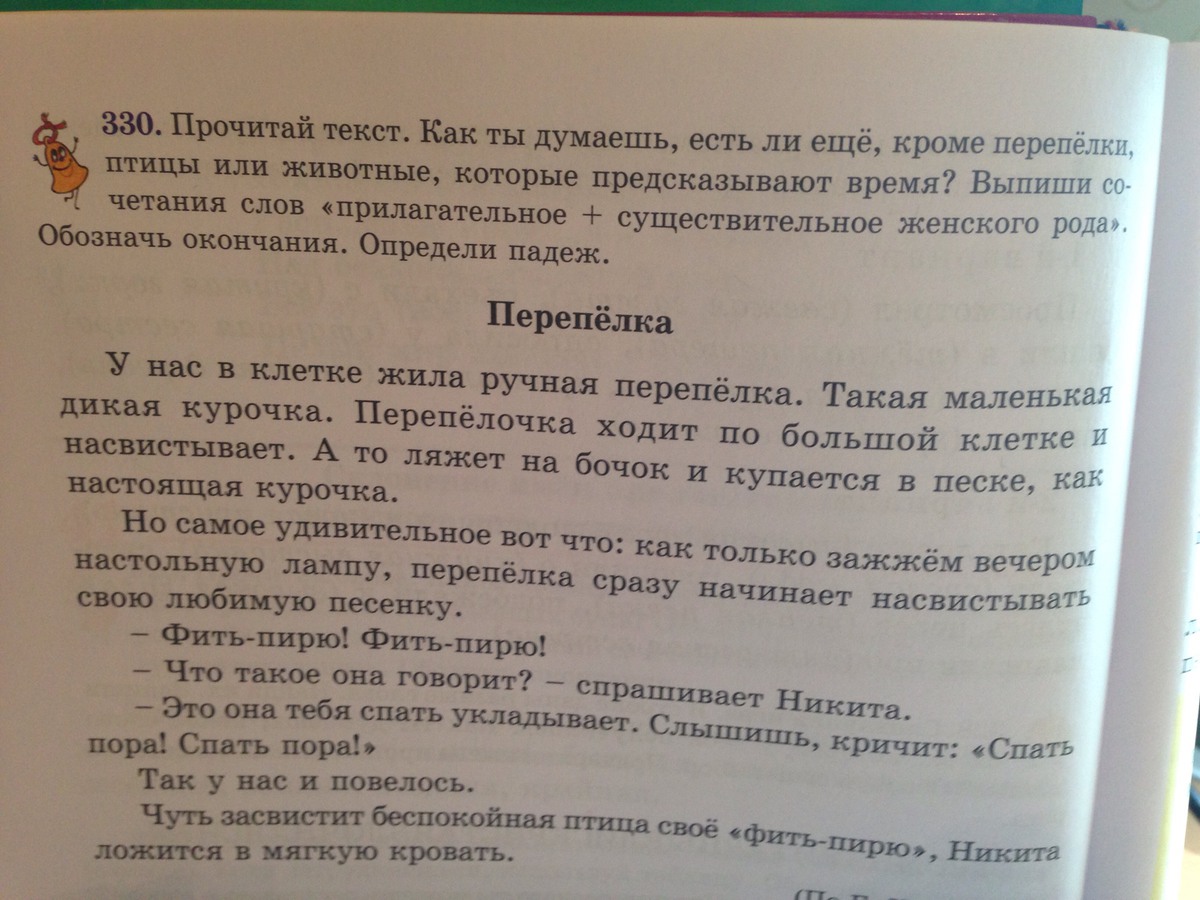 Ручн[ая] перепёлк[а](И.п.), маленьк[ая] дик[ая] курочк[а](И.п.), по больш[ой] клетк[е](Д.п.), настоящ[ая] курочк[а](И.п.), настольн[ую] ламп[у](В.п.), любим[ую] песенк[у](В.п.), беспокойн[ая] птиц[а](И.п.), в мягк[ую] кровать[ ](Р.п.)