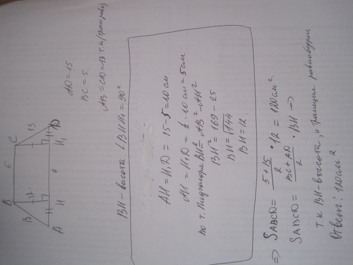 основания равнобедренной трапеции равны 5 см и 15 см, а боковое ребро равно 13 см.найдите площадь трапеции