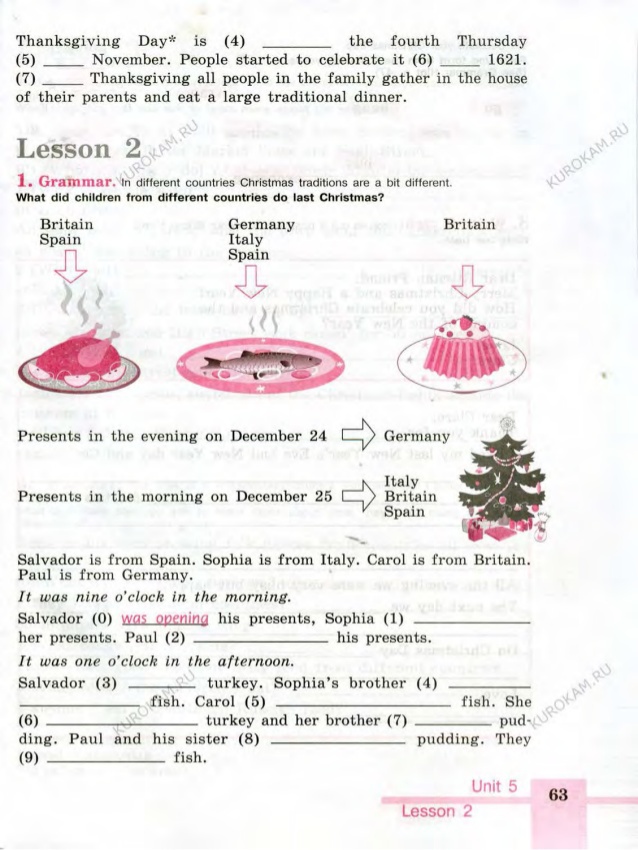 Salvador (0) was opening his presents, Sophia (1)_______ her presents. Paul (2) ________ his presents. It was one o'clock in the afternoon. Salvador (3) __________ turkey. Sophia's brother (4)________ fish. Carol (5)___________ fish. She (6)__________ turkey and her brother (7) ________ pudding. Paul and his sister (8)_________ pudding. They (9)_________ fish.
