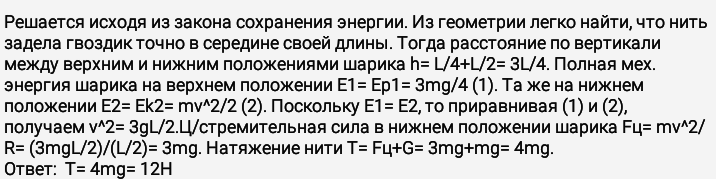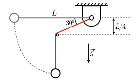 Вблизи вертикальной стенки сконструировали математический маятник, состоящий из лёгкой нерастяжимой нити длиной LL и подвешенного на ней шарика массой m=300 гm=300 г. Маятник отклонили в горизонтальное положение и отпустили без начальной скорости. При движении шарика вниз нить задела вбитый в стенку гвоздик, расположение которого указано на рисунке.