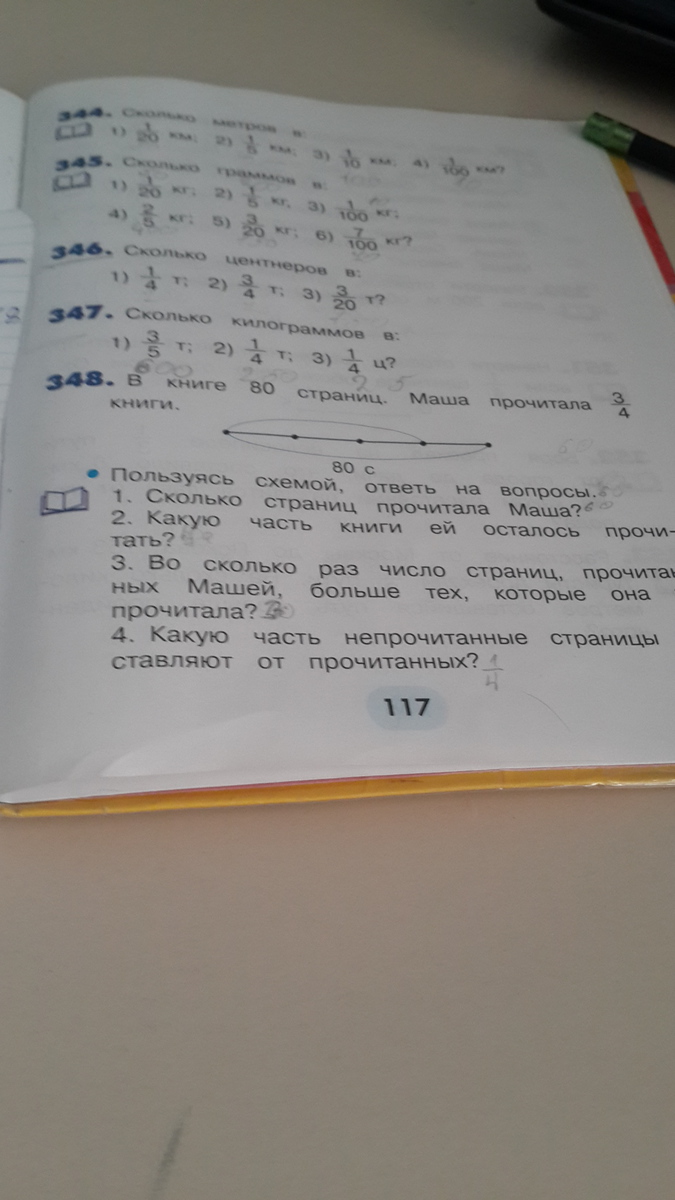 1) всего страниц 80, а Маша прочитала 3/4 значит