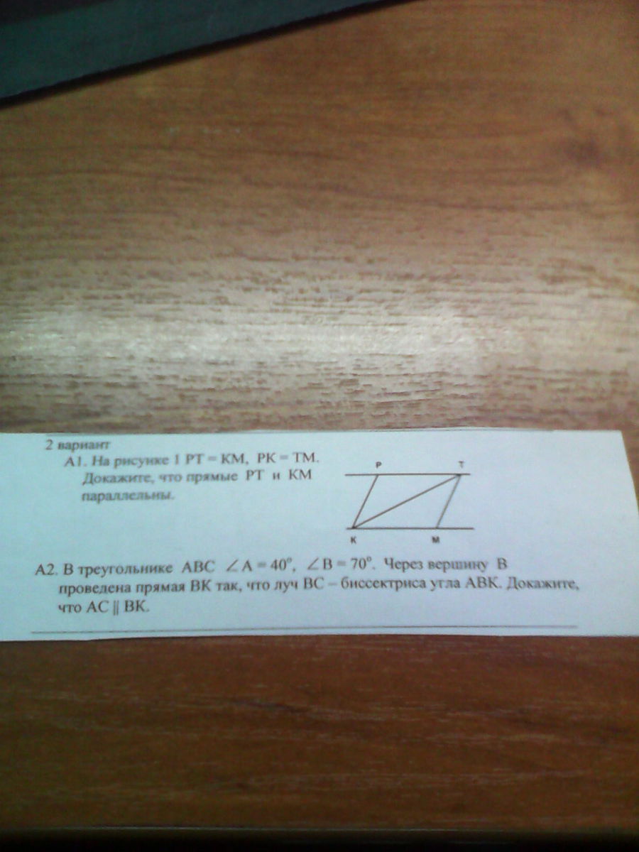 При прямых ВК и АС прямая ВС секущая. Так как внутренние накрест лежащие углы них равны (уг.КВС=уг.ВСА=70гр.), то ВК||АС по признаку параллельных прямых.
