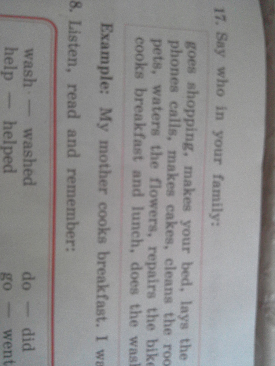 I make my bed. My little sister lays the phones calls. My mother makes very tasty cakes and cleans the room very well. I usually waters the flowers.