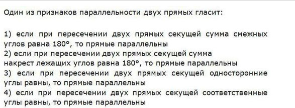 Теорема 2. Если две параллельные прямые пересечены секущей, то:накрест лежащие углы равны;соответственные углы равны;сумма односторонних углов равна 180°.