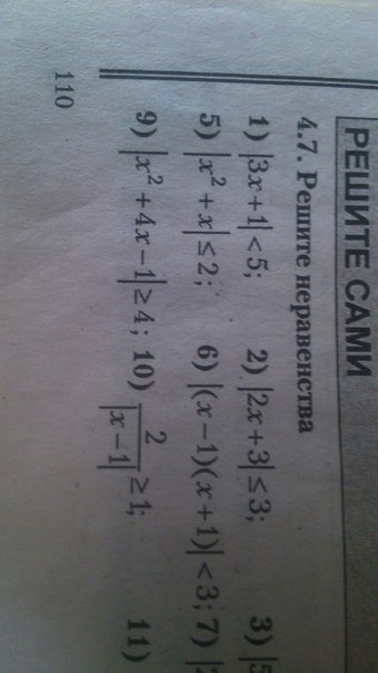 9)|х^2+4x-1|>=4<=>х^2+4x-1>=4 ИЛИ x^2+4x-1<=-4<=>(x-3)(x-1)>=0 ИЛИ (x+1)(x+3)>=0<=>x принадлежит (-бесконечности;-3]объеденить с [-1;+бесконечности)
