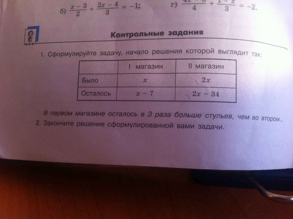 Во втором магазине было в 2 раза больше. чем в первом. После того, как в первом продали 7 стульев, а во втором продали 34 стула, оказалось, что в первом магазине осталось в 3 раза больше стульев , чем во втором.