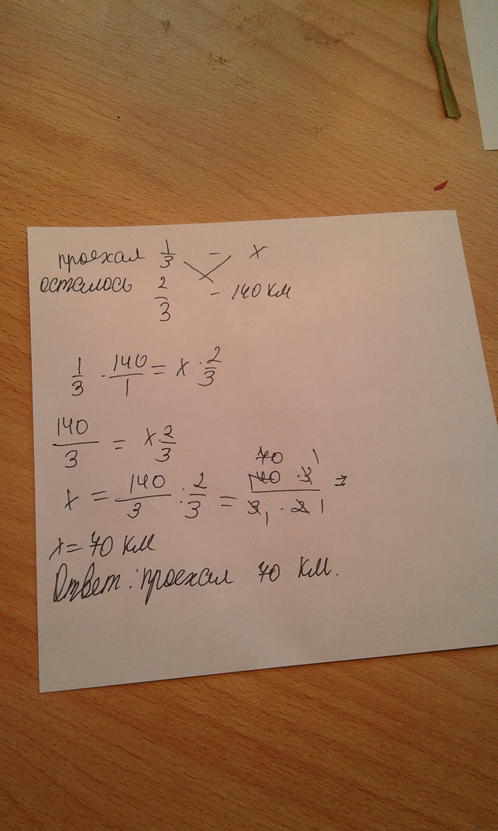 Мотоциклист проехал 1/3 намеченного маршрута.Сколько километров проехал мотоциклист,если осталось 140 км до конца маршрута???