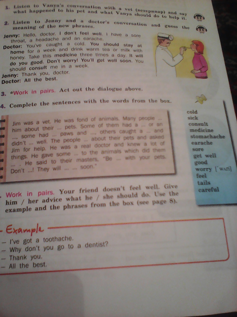 consulted, sick, stomachache, earache, sore, tails, cold, feel, worried, medicine, better, careful, worry, get well