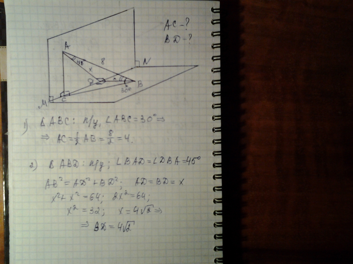 Концы отрезка AB принадлежат двум перпендикулярным плоскостям. Углы между прямой AB и плоскостями равны 30 и 45 градусов. Найдите расстояние от концов отрезка AB до прямой пересечения плоскостей, если AB= 8 см.