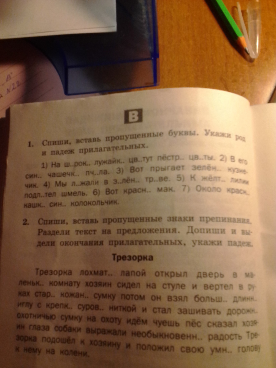 1) На широкой лужайке цветут пёстрые цветы. 2) В его синей чашечке пчела. 3) Вот прыгает зелёный кузнечик. 4) Мы лежали в зелёной траве. 5) К жёлтой линии подлетел шмель. 6) Вот красный мак. 7) Около красной кашки синий колокольчик.