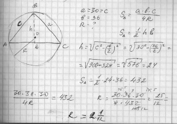 Боковые стороны равнобедренного треугольника равны 30, основание равно 36. Найдите радиус описанной окружности этого треугольника.