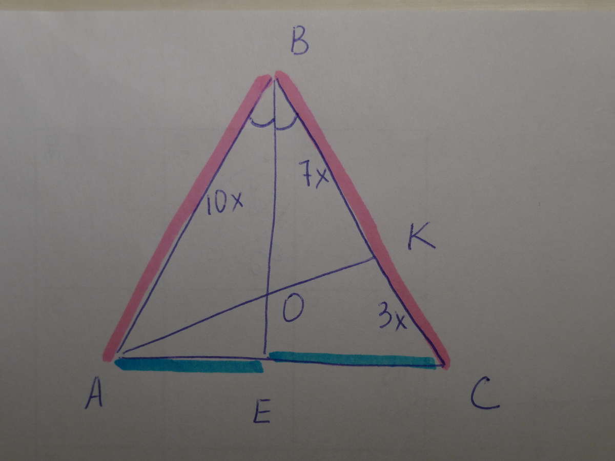 Помогите очень срочно, умоляю! Дам 50 баллов, только решите! В равнобедренном треугольнике точка Е - середина основания АС, а точка К делит сторону ВС в отношении 3:7, считая от вершины С. Найдите отношение, в котором прямая ВЕ делит отрезок АК. Не нужен просто ответ, нужно решение. Помогите, прошу!