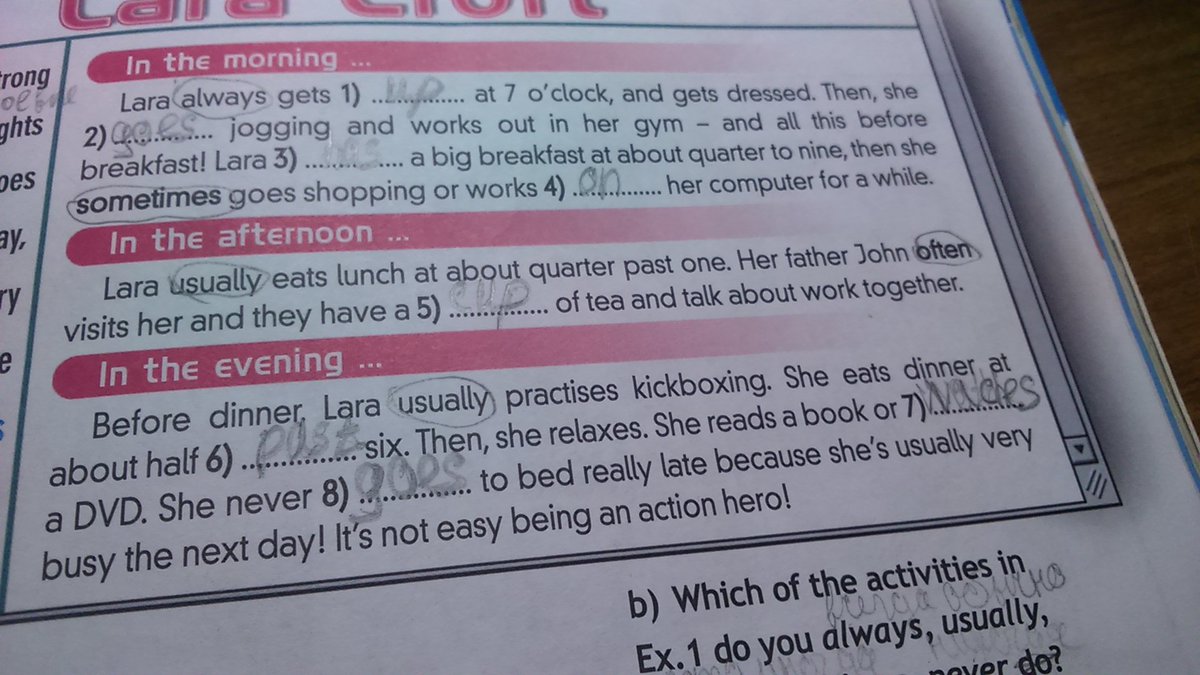 Лара обычно ест ужин примерно в четверть второго.Ее папа джон постоянно посещает ее и они начинают пить чай и разговаривать о сегоднящней работе.