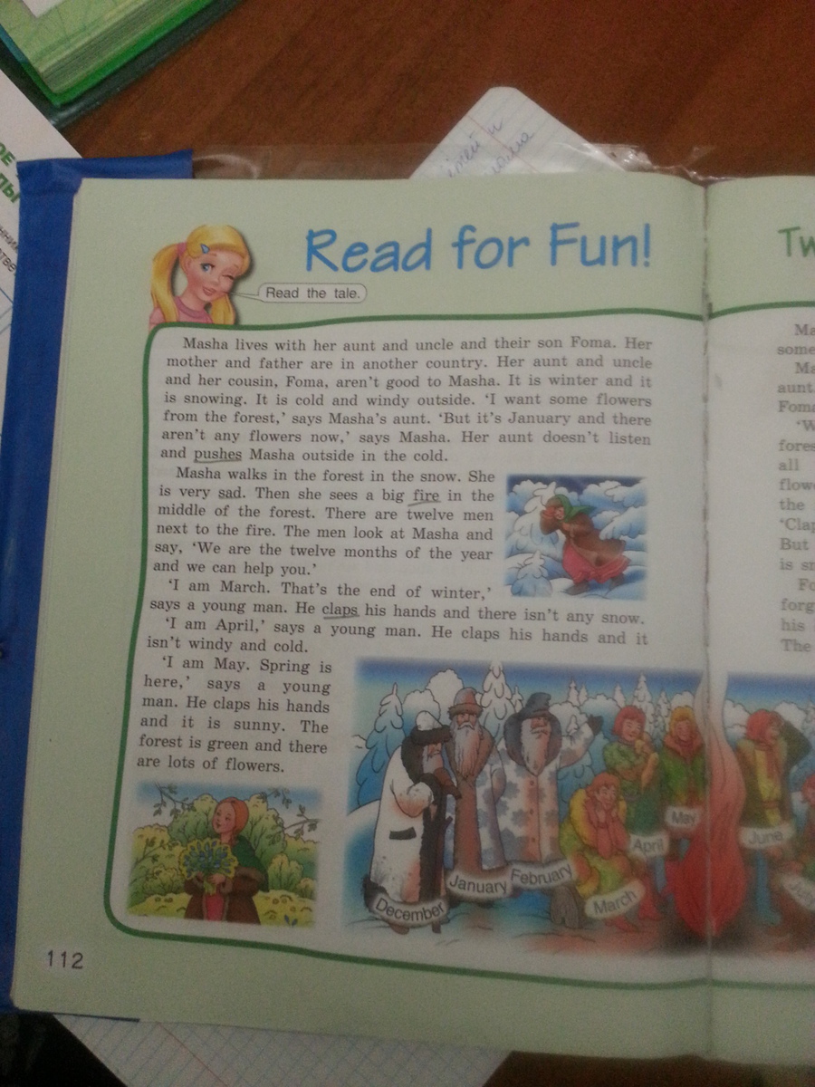 Маша гуляла в лесу по снегу.Она была очень грустной.Тогда она увидела большое пламя в центре леса. 12 мужчин были около огня.Мужчина посмотрел на Машу и сказал, "Мы 12 месяцев года и мы можем помочь тебе".