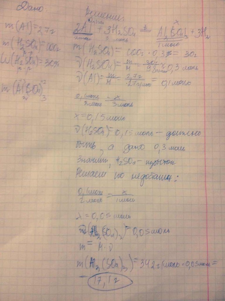1)Определить массу сульфата алюминия, который должен получиться при взаимодействии 2,7 г алюминия со 100 г 30%-ного раствора серной кислоты.