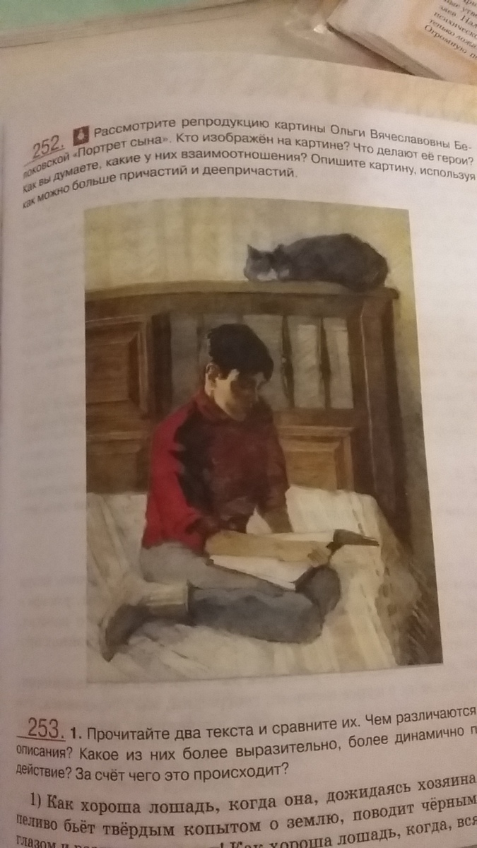 На картинеО.В.Белоковской мы видим молодого человека, сына художника, читающего книгу. Он сидит на кровати, подвернув ноги, одетый в теплый свитер и носки.