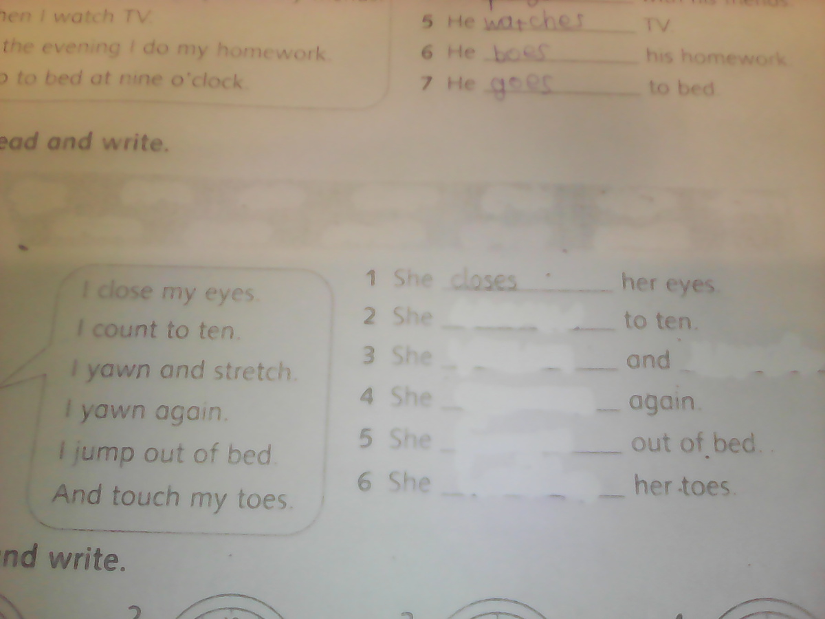 2. Counts, 3. yawns and stretches, 4. yawns, 5. jumps, 6. touches. Правило:когда действия выполняет он или она, мы добавляем окончание -s или-es к глаголу.