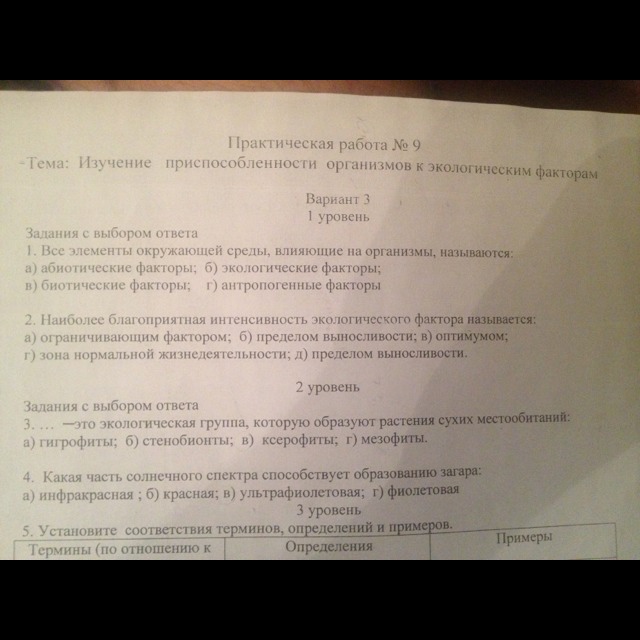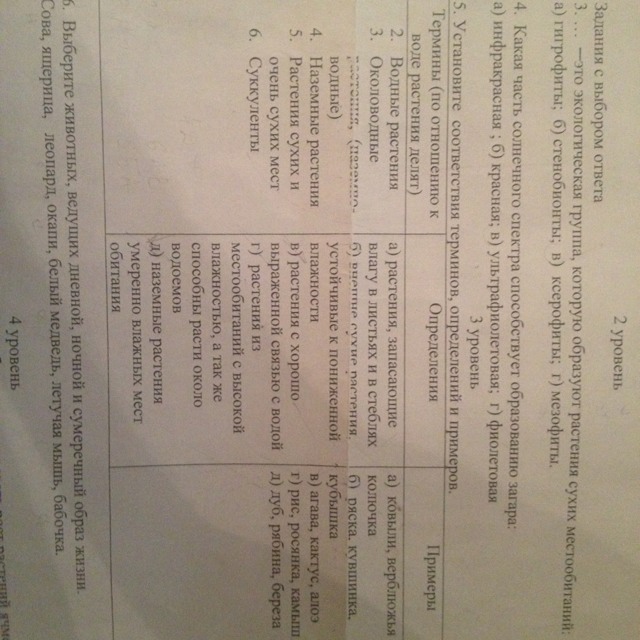 1-б; 2-в; 3-в; 4-в; 5: 2-в-б; 3-г-г; 4-д-д; 5-б-а; 6-а-в; 6: дневной о. ж.: ящерица, окапи, белый медведь, бабочка; сумеречный: леопард; ночной: сова, летуч. мышь