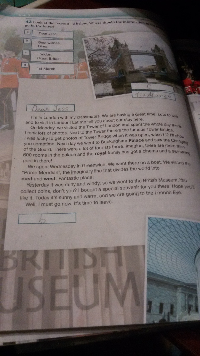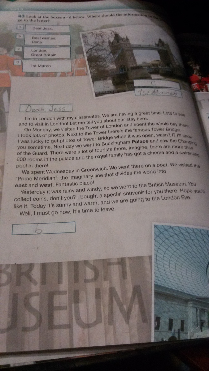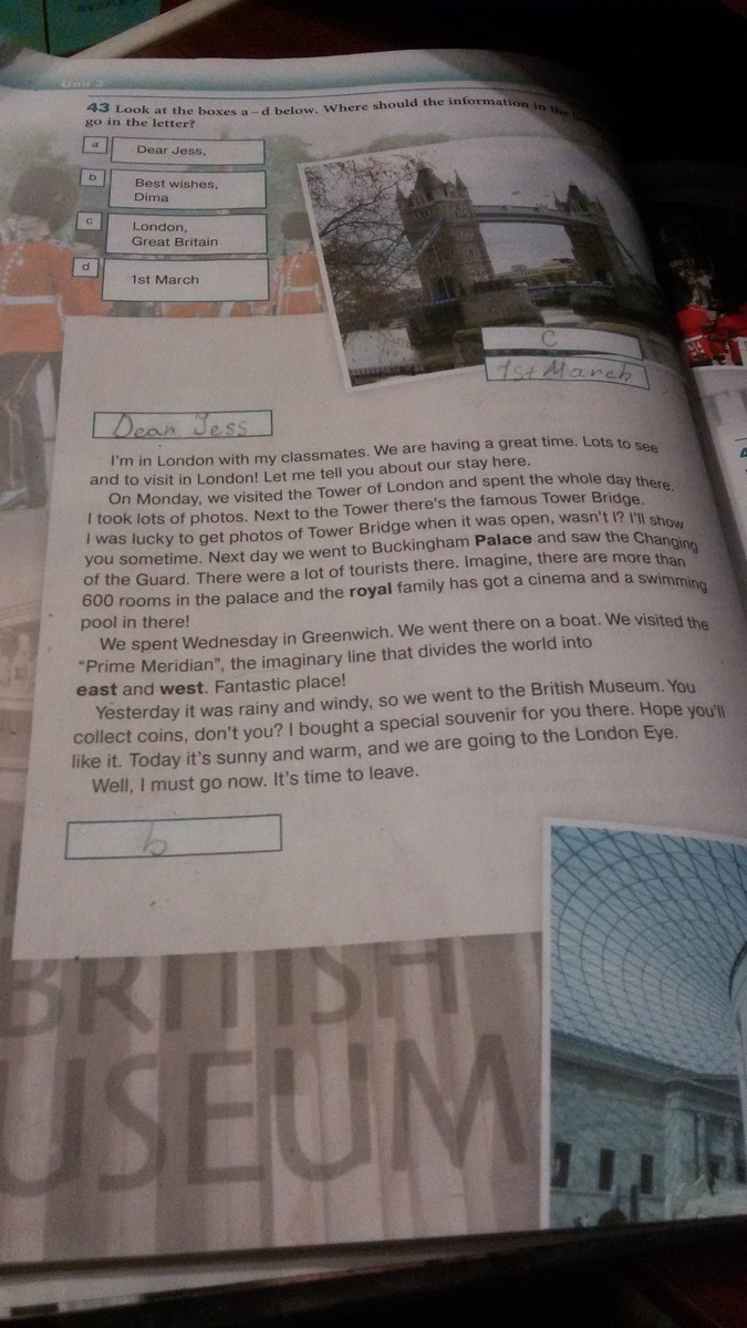 мы в среду пошли в Гринвичь. Мы пошли туда на лодке. Мы посетили дом в "меридиана," воображаемая линия делит мир на востоке сделал и запад. Фантастическое место! вчера было дождливо и ветрено, что, таким образом, мы пошли в Британский музей. Вы собираете монеты, не так ли? Я купил специальный сувенир для вас там. Надеюсь, вам понравится. Сегодня солнечно и тепло, и мы собираемся Лондонской Eye.