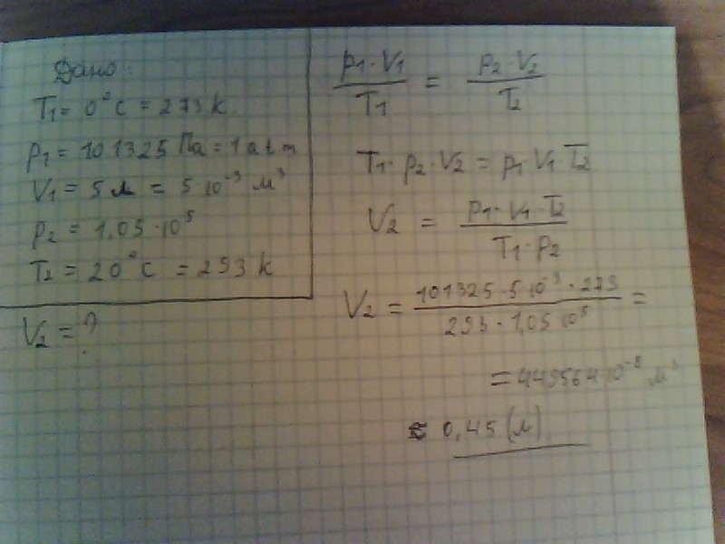 значит, и p₂V₂/T₂=1855,3. отсюда V₂=1855,3·T₂/p₂=1855,3·293/105000≈5,2 л.
