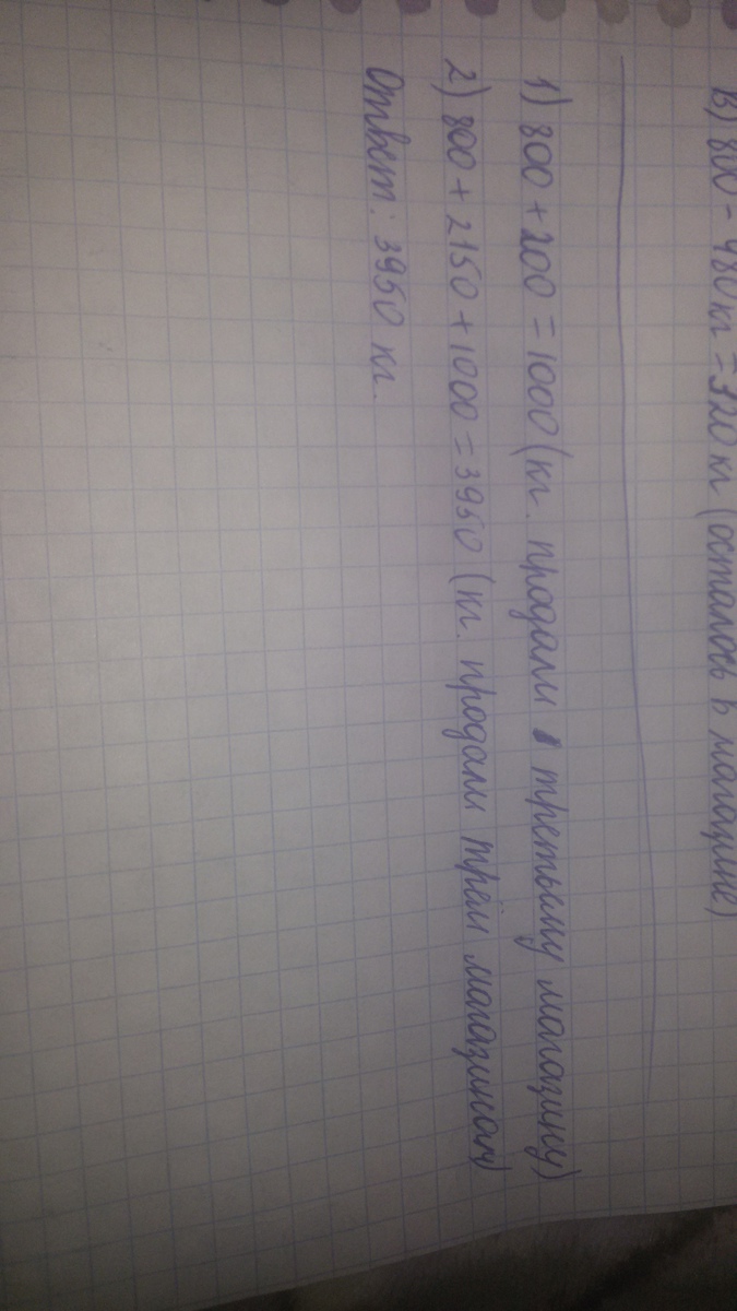 1)2150+800=2950 (кг). 2)800+200=1000(кг).3)2950+1000=3950(кг) ответ:3950 кг изделий продали