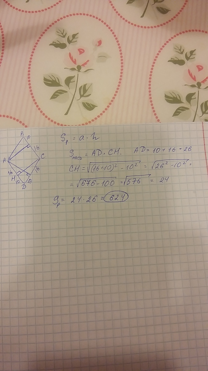 Основание перпендикуляра опущенного из вершины тупого угла ромба на его сторону, делит ее на отрезок 16 и 10 см. начиная от вершины тупого угла. Найти площадь ромба.