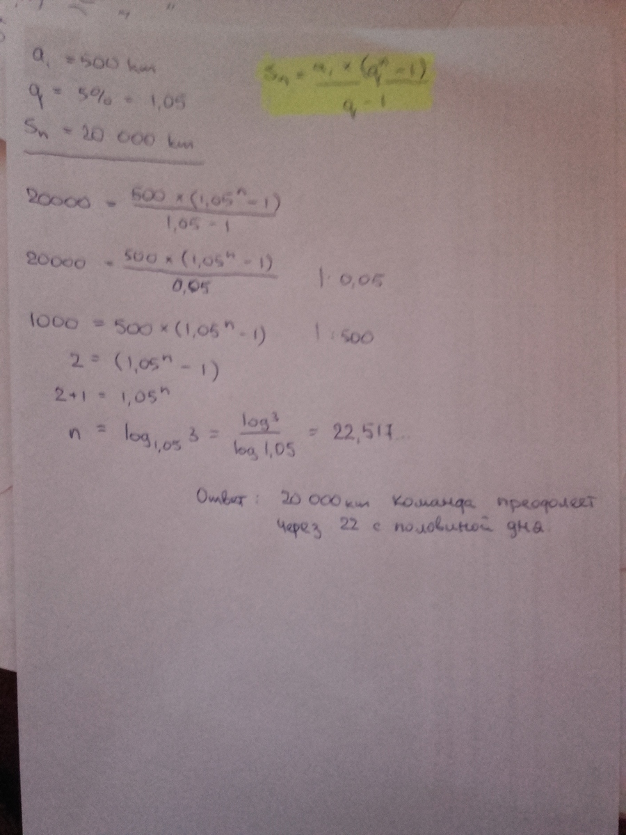 В ралли Париж-Дакар команда КАМАЗ проехала 500 км, каждый следующий день команда увеличивала дневную норму на 5% от нормы предыдущего дня. Определить, через сколько дней команда преодолеет путь более 20000км.