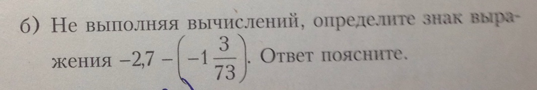 6) Не выполняя вычиёлений, определите знак варажения —2‚7 — (-1 3/73) . Ответ поясните.