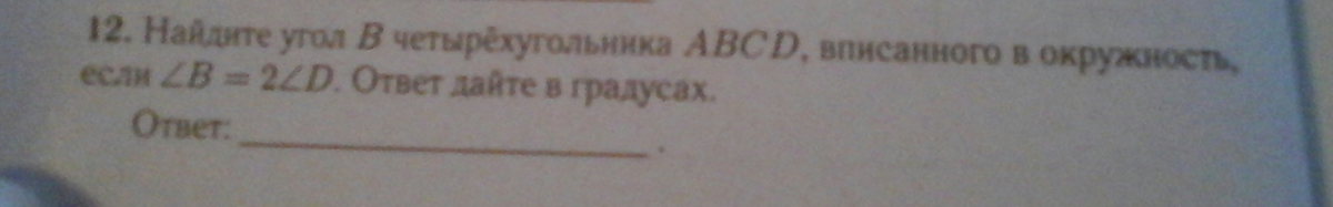 Найдите угол В в четырехугольнике ABCD, вписанного в окружность, если угол В=2углуD.