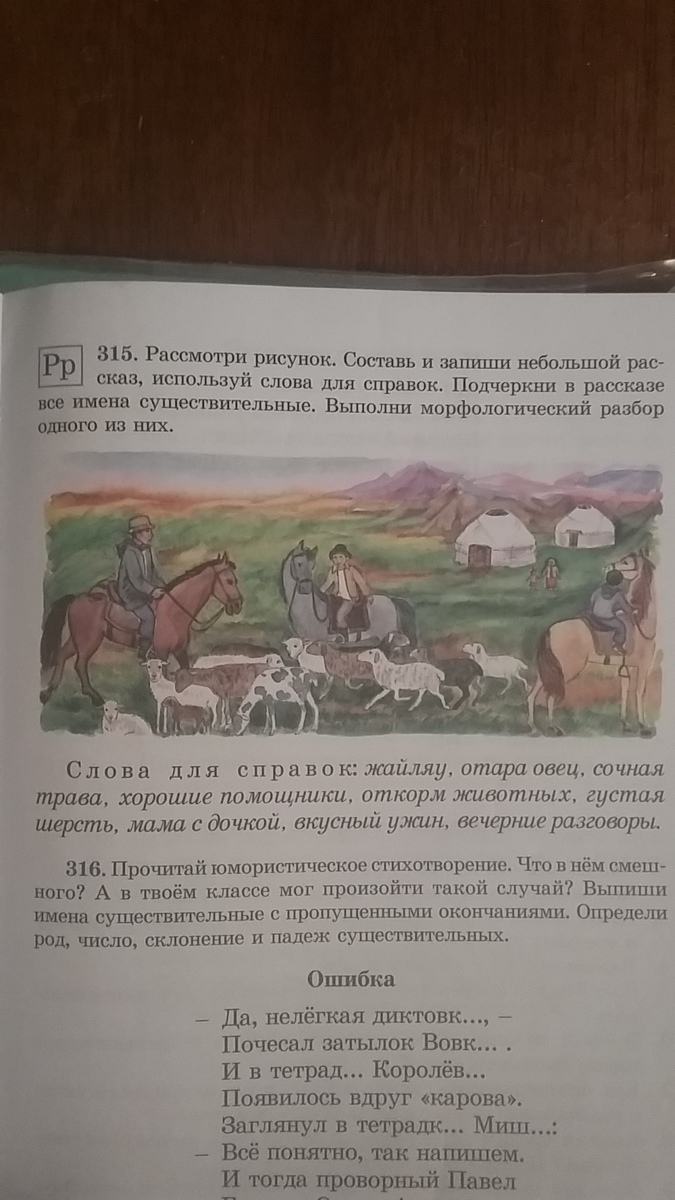 Когда вырастает большая сочная трава, овец для откорма пасут на летнем пастбище, оно называется -джайляу. Мы с братом помогаем отцу выгонять отару овец, сидя верхом на лошадях. Он нас хвалит и говорит , что мы хорошие помощники. А мама с сестрёнкой хлопочут по хозяйству. Когда вечером вся семья собирается вместе, нас ждёт вкусный ужин. Мы сидим вокруг очага и ведем неспешные вечерние разговоры.