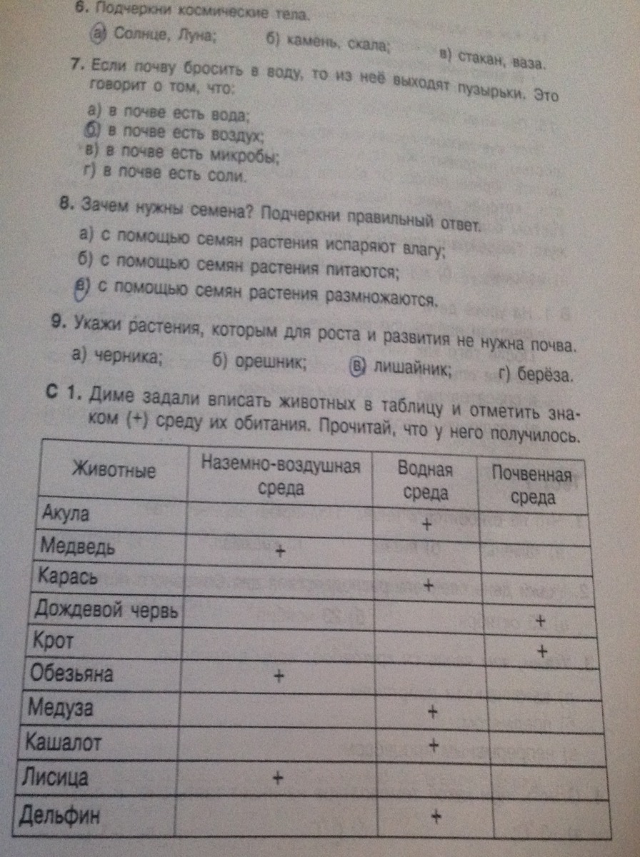 Диме задали вписать животных в таблицу и отметить знаком"+" среду их обитания. Прочитайте, что у него получилось.