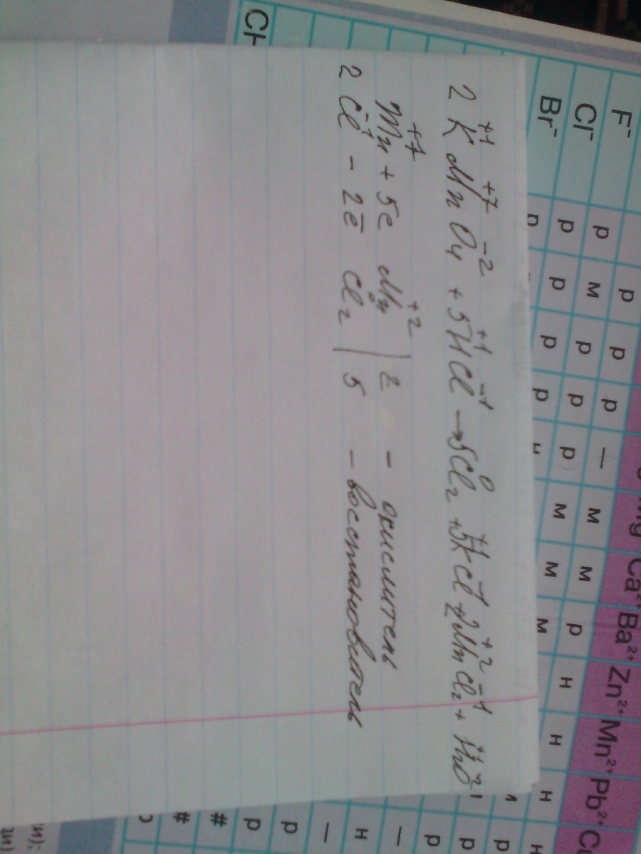 напишите окислительно-восстановительную реакцию, подберите коэффициенты, составив электронно ионный баланс. Укажите окислитель и восстановитель. KMnO4+HCl--->Cl2+kCl+MnCl2+H20
