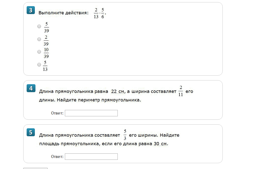 3)2/13 * 5/6 = 1/13 * 5/3 = 5/39