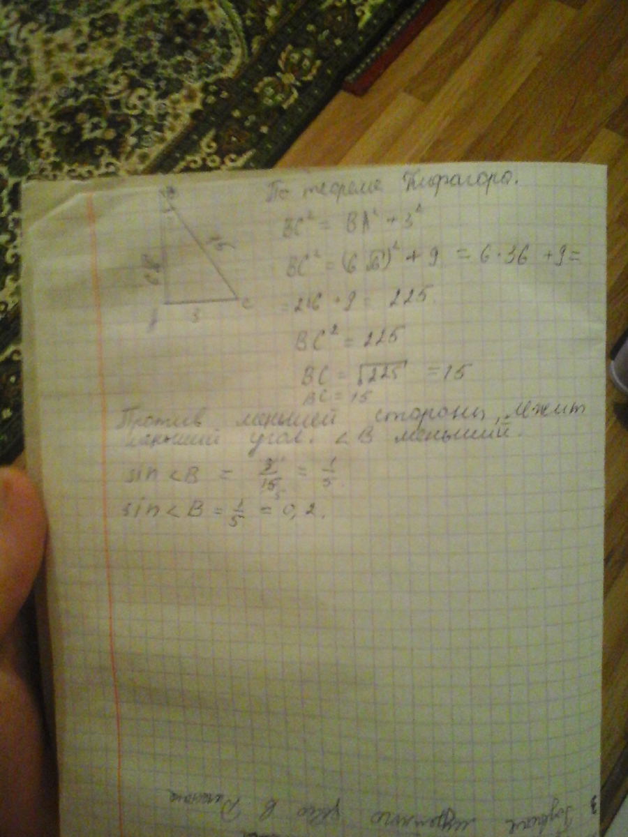 Катеты прямоугольного треугольника равны 6 корень из 6 и 3. Найдите синус наименьшего угла этого треугольника.