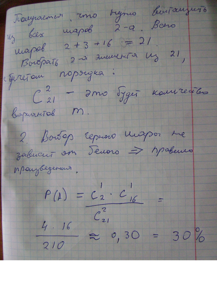 В урне находятся 2 белых,3 красных и 16 черных шаров.какова вероятность того что из вынутых наудачу двух шаров один окажется белым,а другой черным?