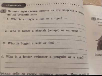 Напишите правильные ответы на эти вопросы и переведите их на русский язык. 1Who is stroner a lion or a tiger? 2 Who is faster a cheetah (гепард) or an emu? 3 Who is bigger a wolf or fox? 4Who is a swimmer a penguin or a man?