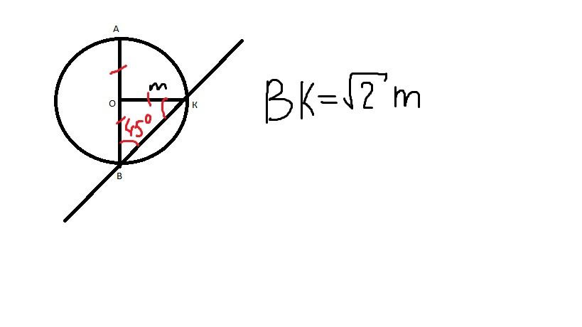Чтобы найти линию пересечения сферы плоскостью, нужно найти диаметр окружности, которая образовалась на шаре в результате сечения. На рисунке АО = ОВ = ОК - радиусы шара = 2m/2 = m. Треугольник ОВК - равнобедренный, поэтому угол ОВК равен углу ОКВ , и оба они по 45 градусов, следовательно, угол ВОК = 180 - 45 - 45 = 90 градусов. Из прямоугольного треугольника ОВК: BK^2 = BO^2 + KO^2, BK^2 = m^2 + m^2, BK^2 = 2m^2, BK = sqrt(2m^2) (корень из 2m^2), BK = sqrt(2)*m, то есть, длина линии пересечения данной сферы данной плоскостью равна корень из двух, умноженный на m.