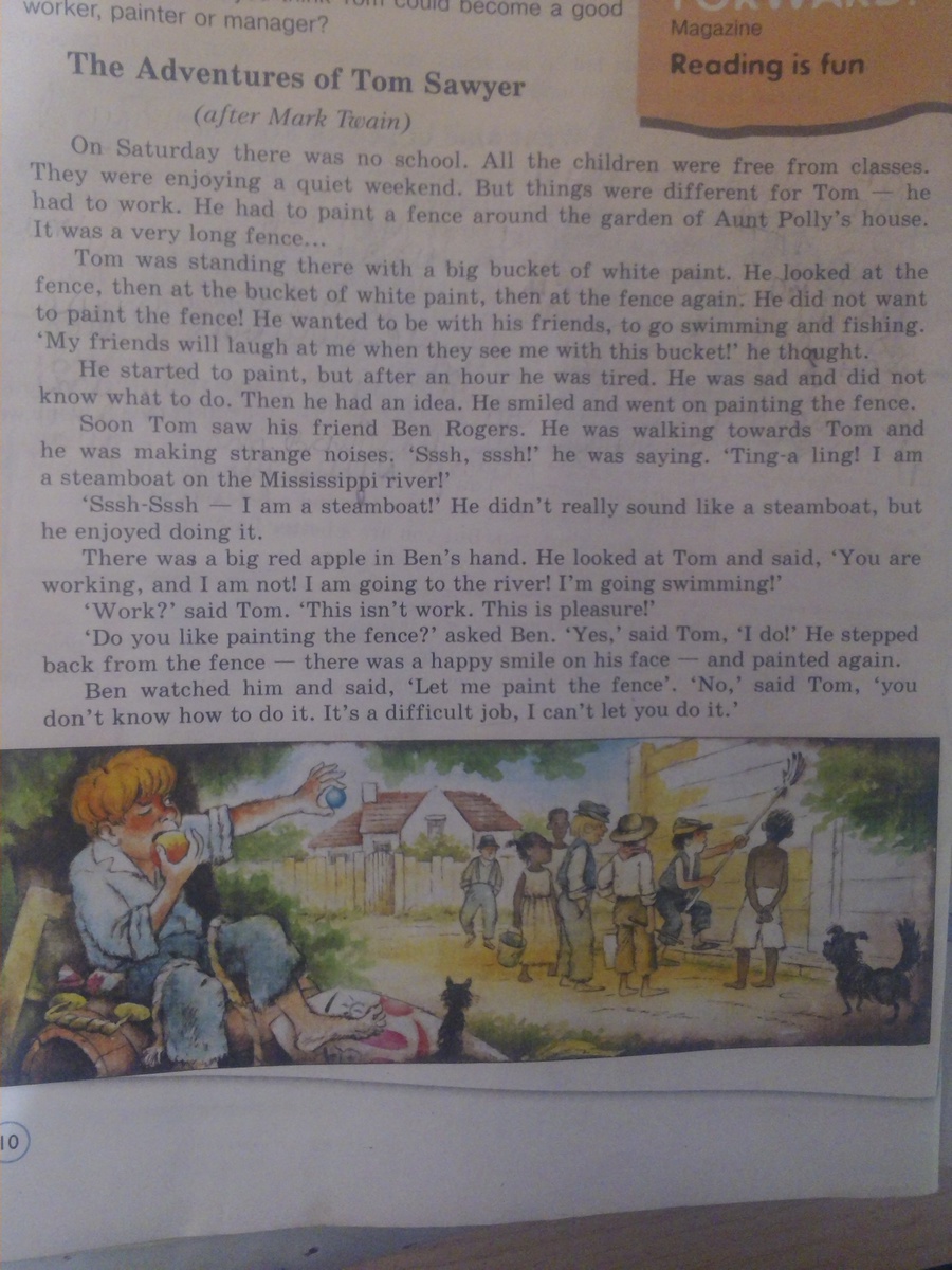 В субботу не было школы.все дети были выпущены из классов.Они наслаждались спокойным викендом.но для Тома было все по-другому-он должен был работать.Он длжен был красить забор вокруг сада дома тети Поли.это был очень длинный забор.Том стоял там с большим ведром белой краски.Он смотрел на забор ,потом на ведро с краской потом снова на забор. Он не хотел красиьь забор.Он хотел быть со своими друзьями,пойти поплавать и порыбачить.Мои друзья будут смеяться надо мной когда увидят меня с этим ведром-подумал он.Он начал красить но через час он устал.он загрустил и не знал что делать.тогда у него появилась идея.он улыбнулся и продолжил красить забор.Вскоре Том увидел своего друга Бена Роджера.Он шел к Тому и издавал странный звук."с-с-с"-сказал он."я -лодка на реке Миссиссиппи"."я лодка! на самом деле он не издавал звук как у лодки,но он был доволен этим. В руке Бена было большое красное яблоко.Он посмотрел на Тома и сказал:ты работаешь,а я нет! я собираюсь на речку.Я собираюсь поплавать."Работаю?"-сказал Том-"это не работа Это удовольствие".Тебе нравится красить забор?спросил Бен