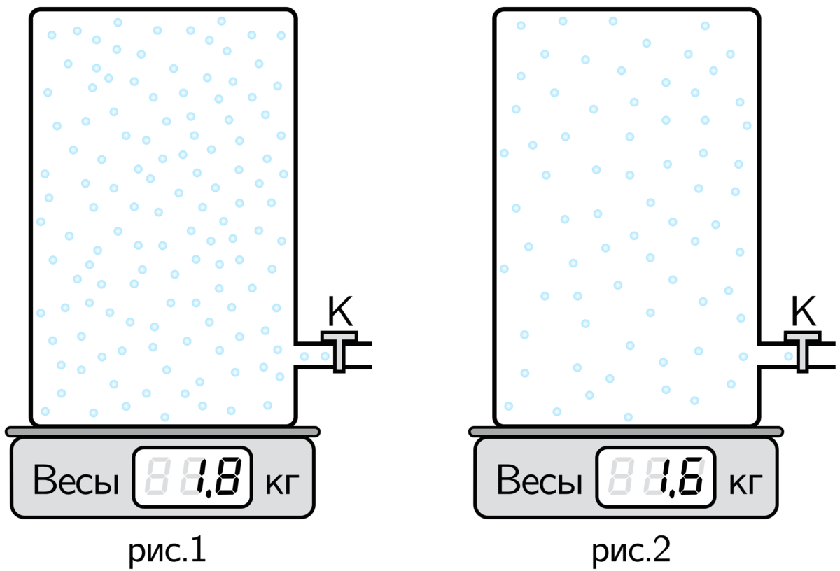 Сосуд, заполненный сжатым газом, поставили на электронные весы, показания которых приведены на рисунке 1. Открыв на некоторое время кран К, из сосуда выпускают часть газа, после чего на весах устанавливаются показания, приведённые на рисунке 2.