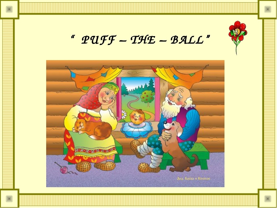 Персонажи: рассказчик, колобок (дословно: Пуф-мячик), заяц, медведь, волк, лиса, ...