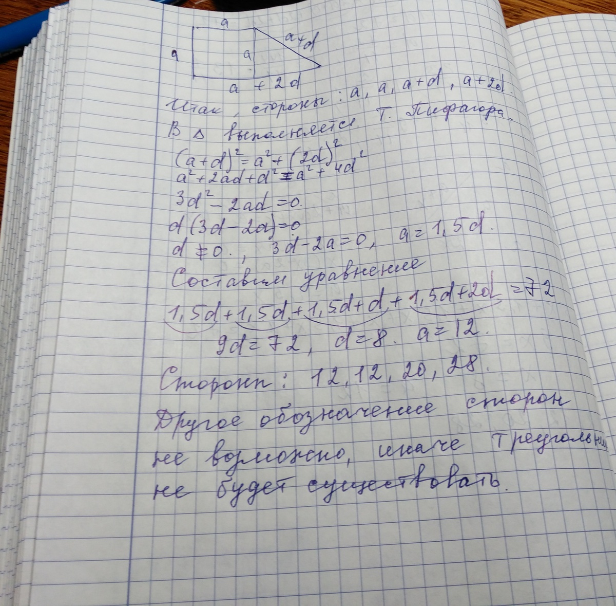 Две меньшие стороны прямоугольной трапеции равны. Три различные стороны трапеции образуют арифметическую прогрессию. Периметр трапеции равен 72 м. Какая из сторон трапеции является наибольшей? Найди все стороны трапеции.